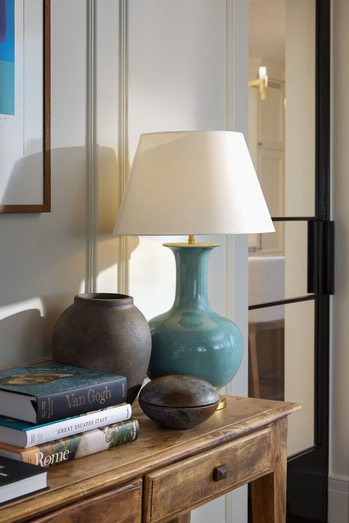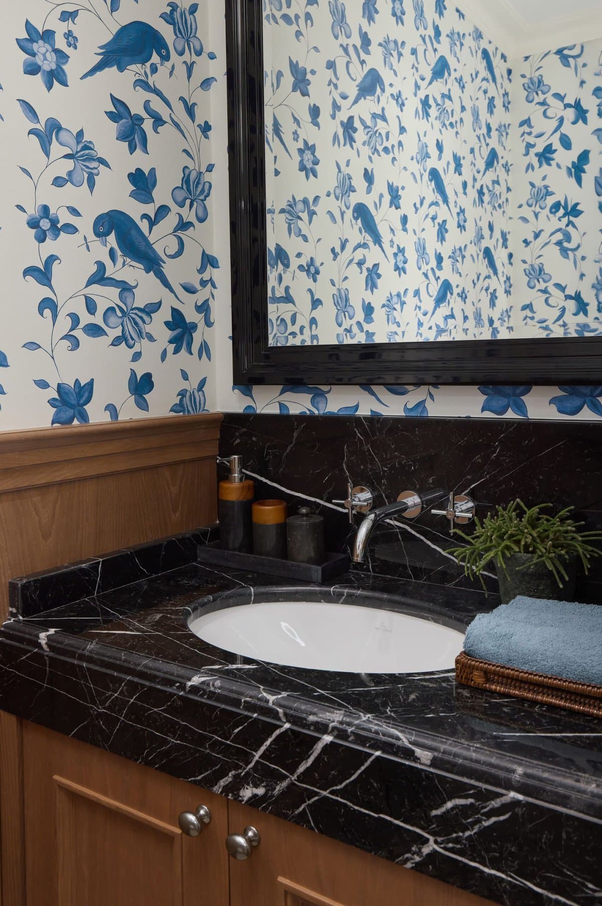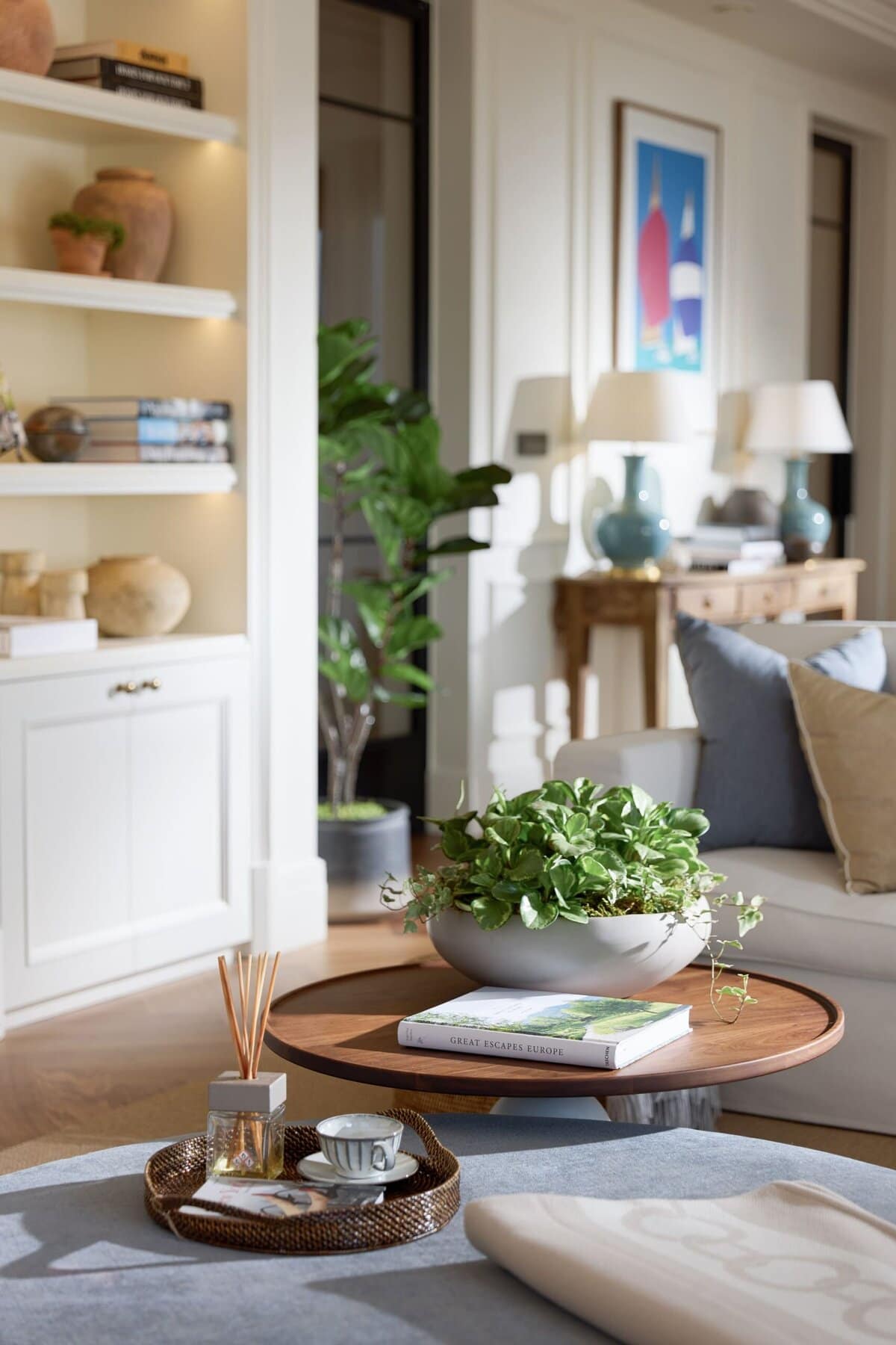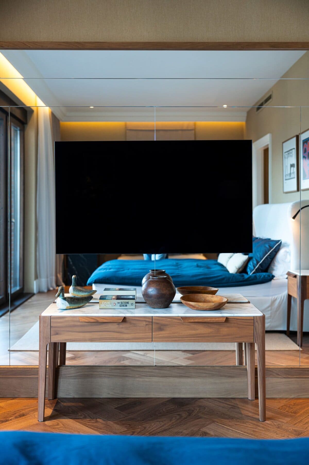 Inspirisan klasičnim engleskim stilom, enterijer je definisan mekim neutralnim tonovima, profinjenim akcentima kraljevsko plave boje i pažljivo odabranim umetničkim delima. Ekskluzivne drvene zidne obloge, ručno obrađeni mermer, izuzetna visina plafona i parket u ribljoj kosti od crnog oraha naglašavaju osećaj suptilnog luksuza u celokupnom prostoru.