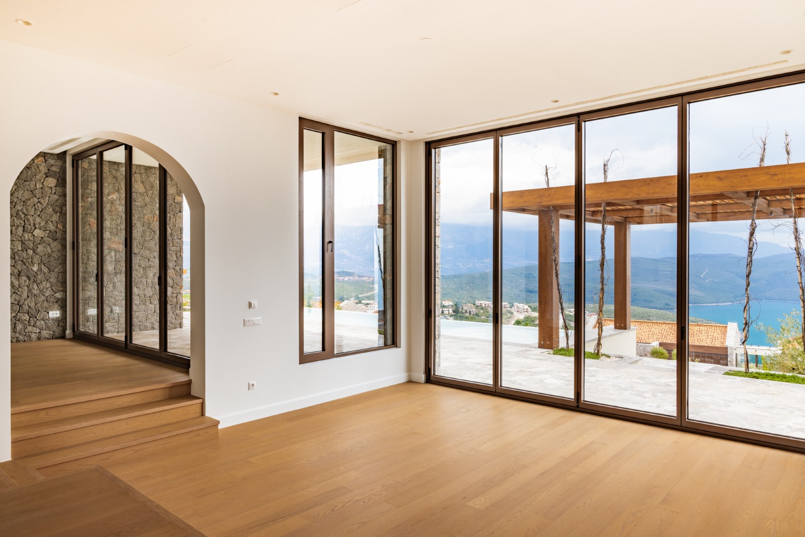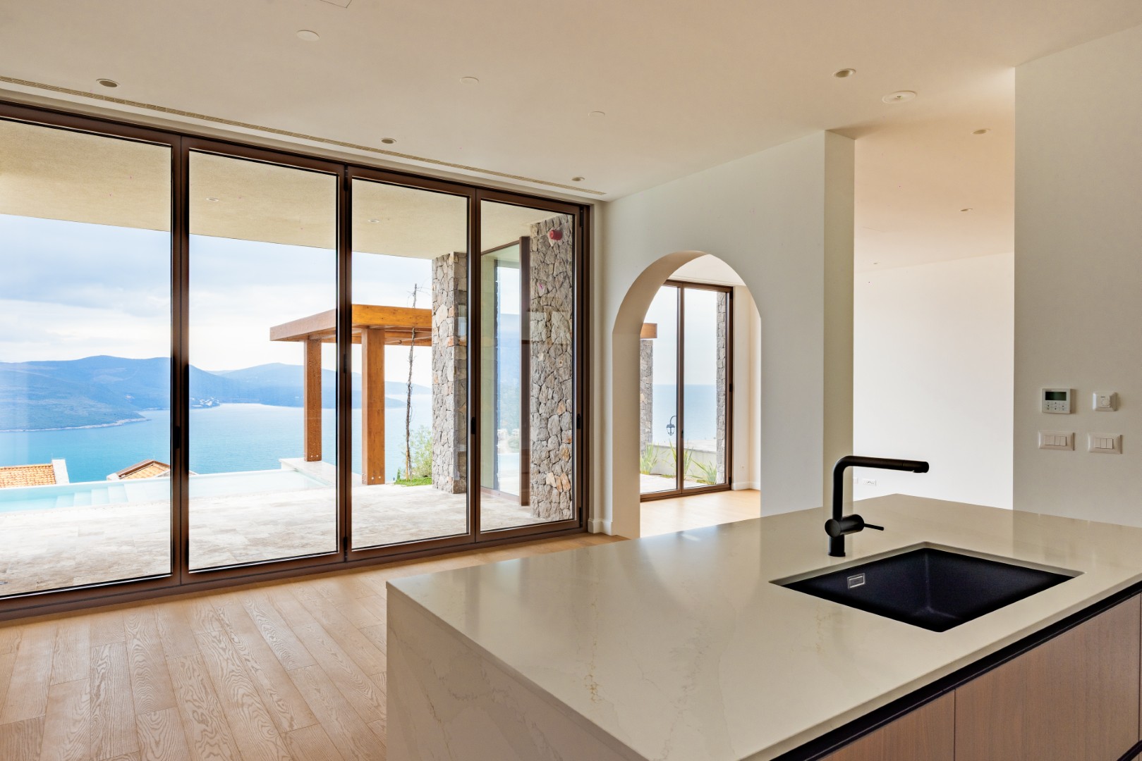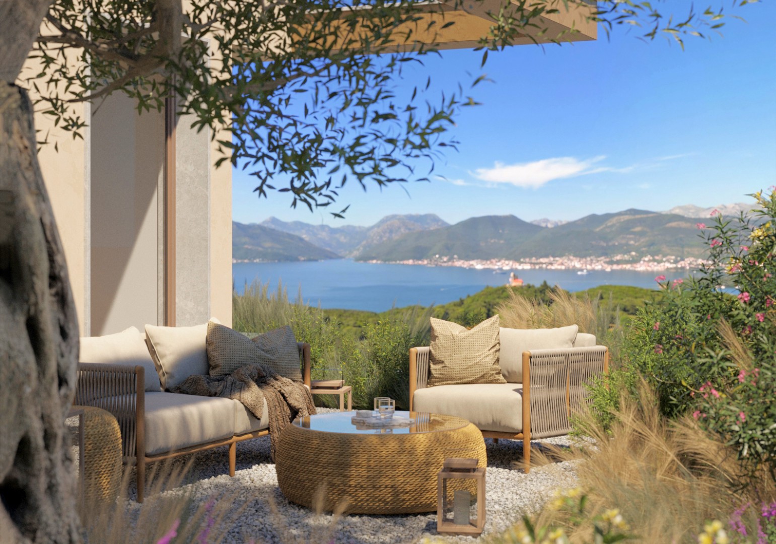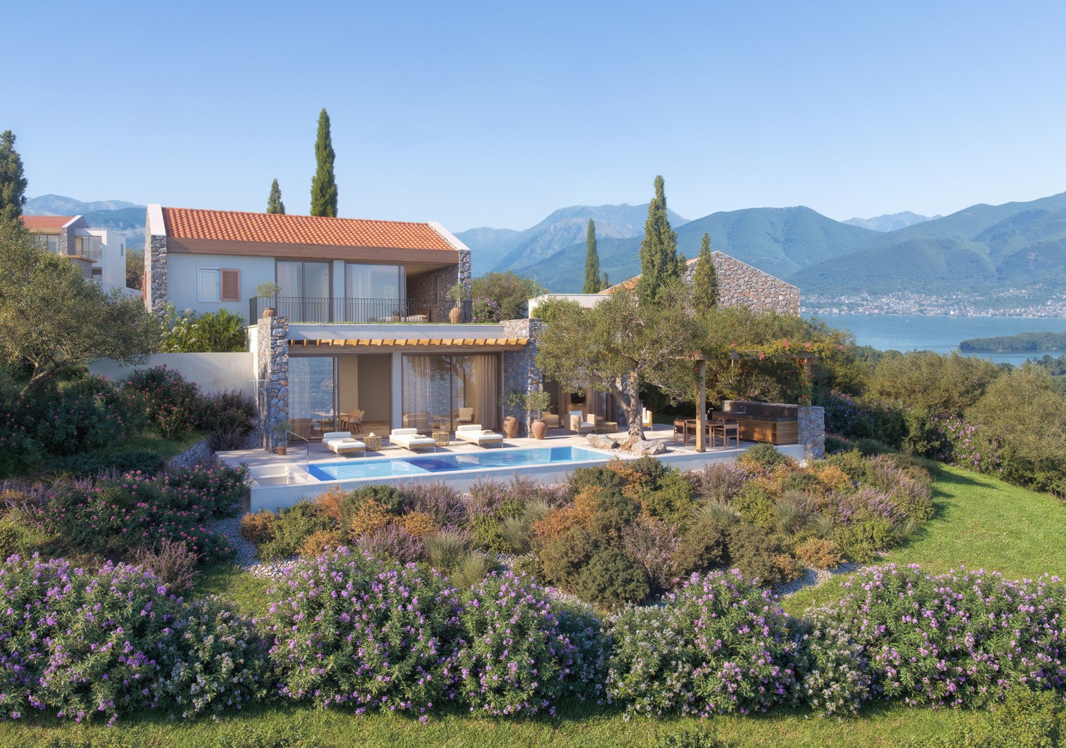 Luštica Bay, elegantna vila površine 339m2, sa 3 spavaće sobe, tri kupatila, bazenom, velikim uređenim zemljištem površine 1,150m2 i pogledom otvoreno more i golf teren. Vila je dio golf destinacije sa kolekcijom novih vila i kuća u nizu.