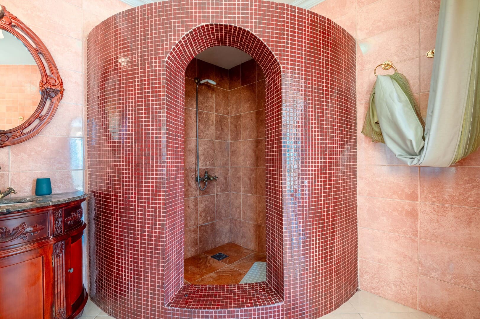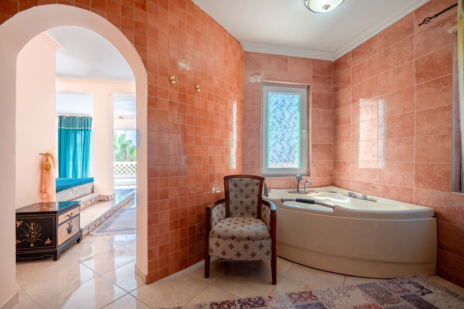 Vila površine 500 m² smještena je na svega 80 metara od mora, sa prostranim vrtom i bazenom ispred objekta. Raspolaže pet spavaćih soba i četiri kupatila sa tuševima, pružajući udobnost i funkcionalnost za cijelu porodicu ili goste.