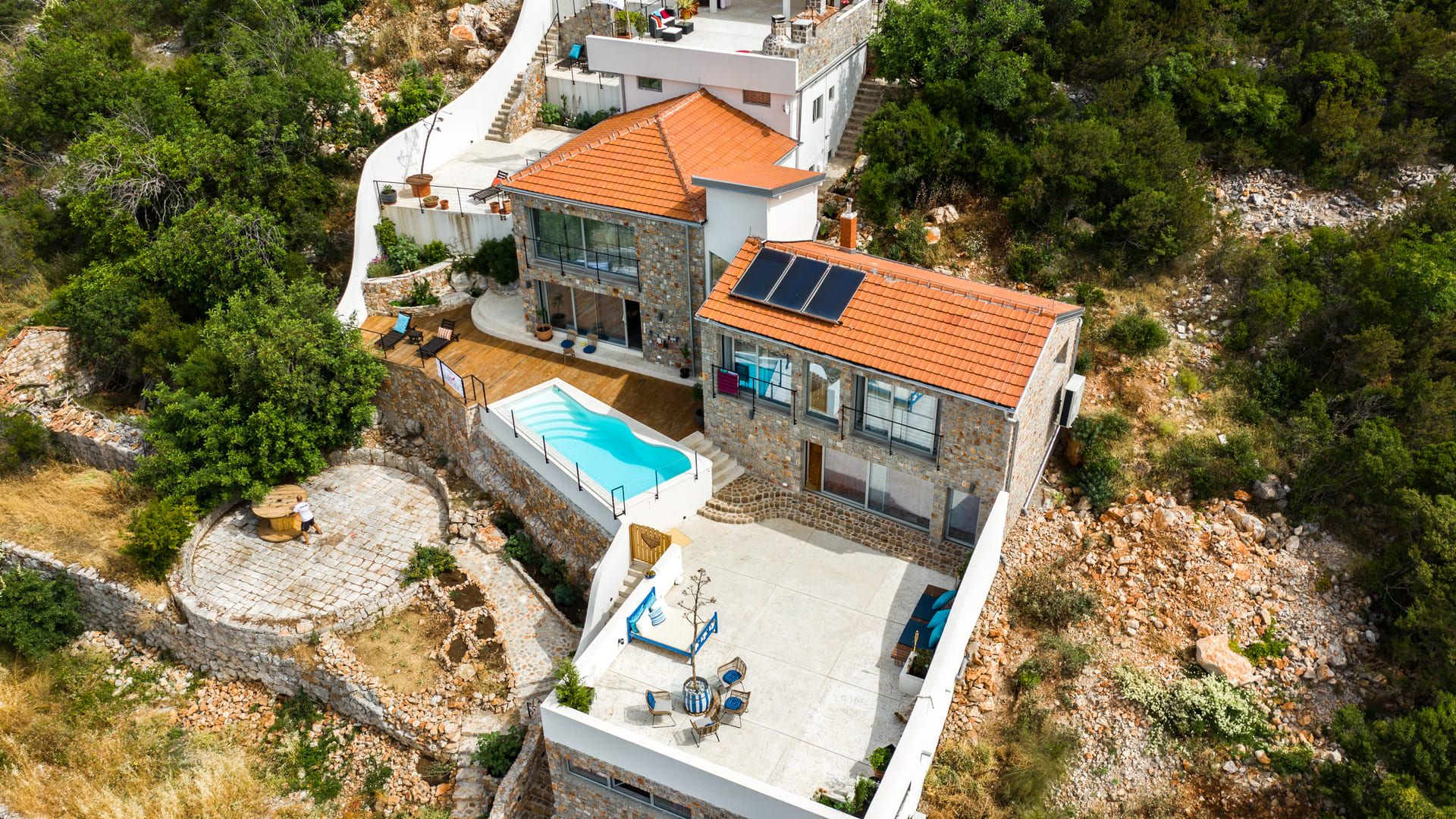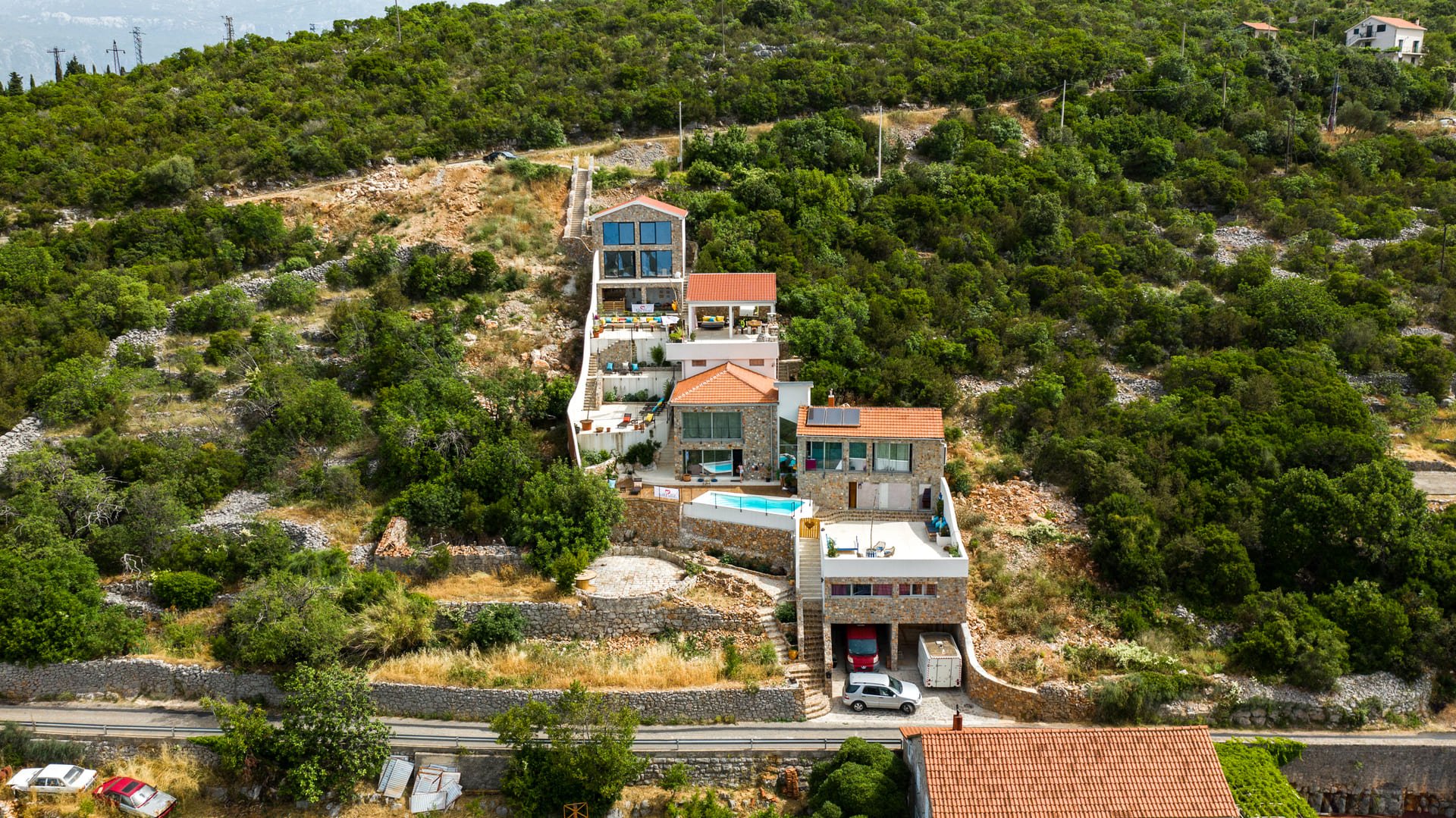 Posjed ima velike terase sa pogledom na Boku Kotorsku, tradicionalno „guvno“, ljetnju kuhinju i bazen. Takođe uključuje prostor za jogu i wellness, prostor za osoblje, garažu i privatni parking.