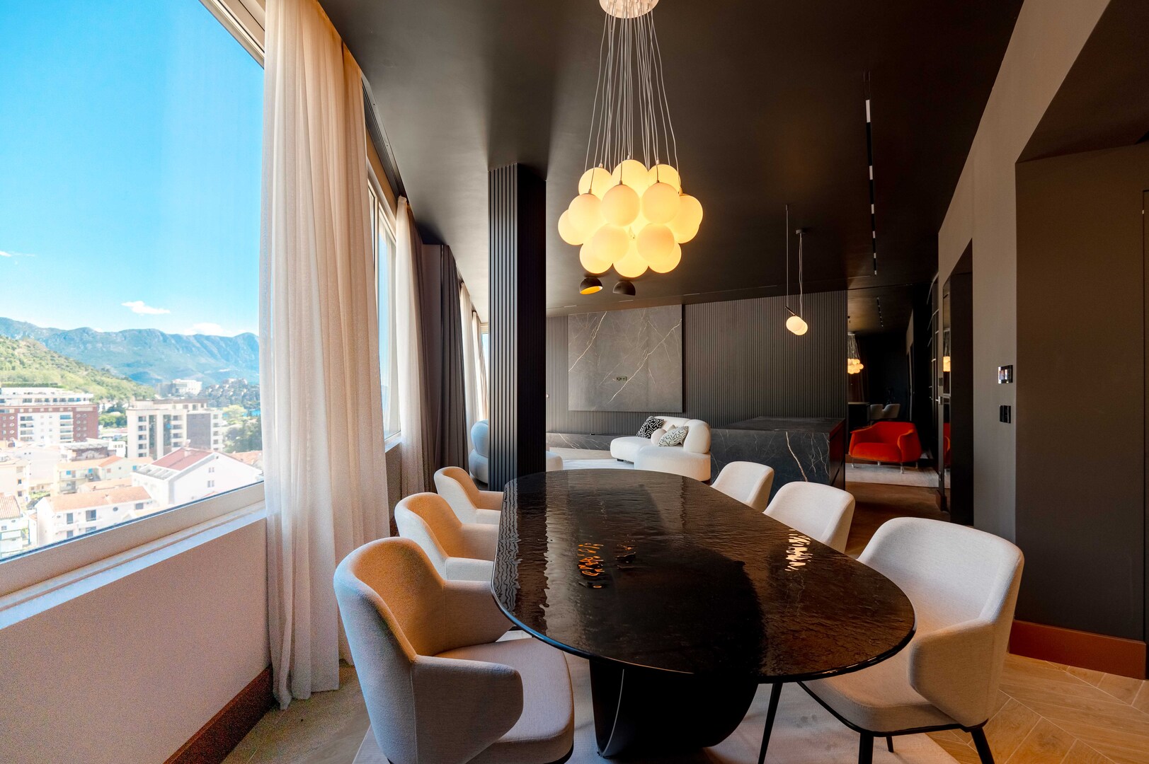 Luksuzan trosoban stan površine 250 m² i dodatnih 200 m² terasa, smješten u modernom objektu visoke klase. Ovaj elegantan stan odlikuje se savremenim dizajnom, vrhunskim materijalima i pažljivo biranim komadima namještaja i rasvjete.