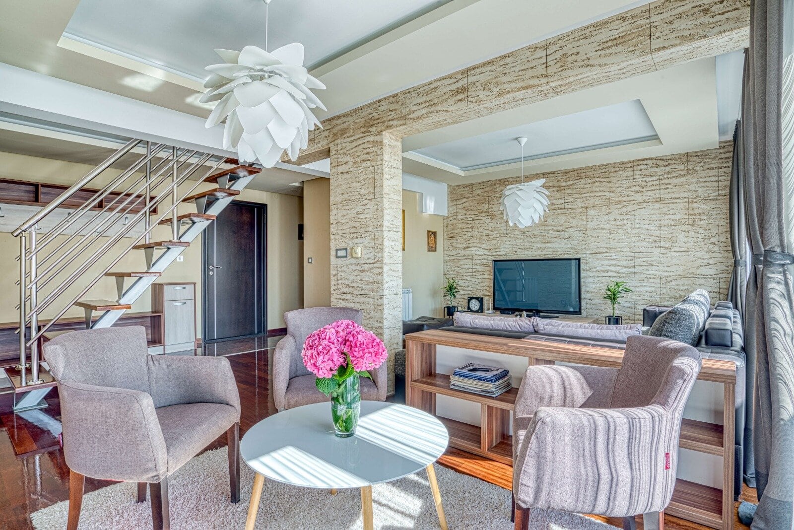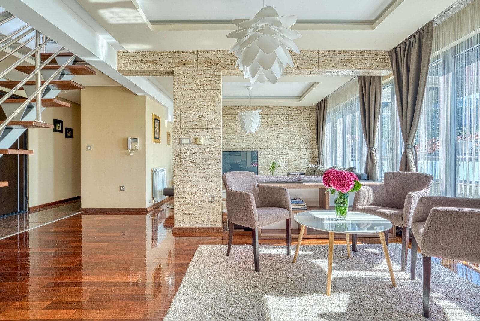 Donja etaža uključuje prostranu terasu sa izuzetnim pogledom na more, kojoj se pristupa iz spavaće sobe, dnevne sobe i trpezarije. Na gornjoj etaži nalaze se galerija, dodatna spavaća soba, kupatilo, terasa i veliki garderober.