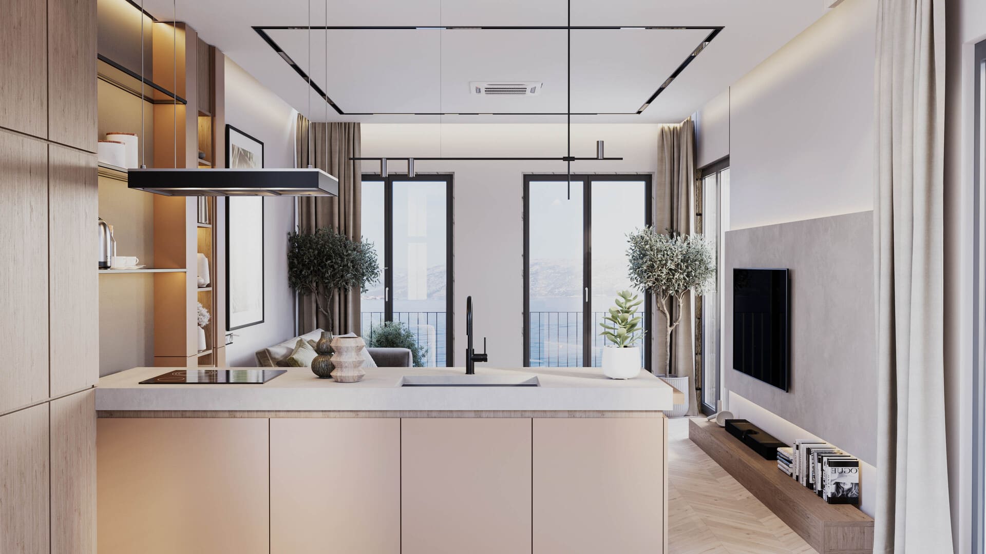 Stan se sastoji od dnevnog boravka sa trpezarijom i kuhinjom, dvije spavaće sobe, dva kupatila i terase od 6 m2 sa pogledom na Bokokotorski zaliv.