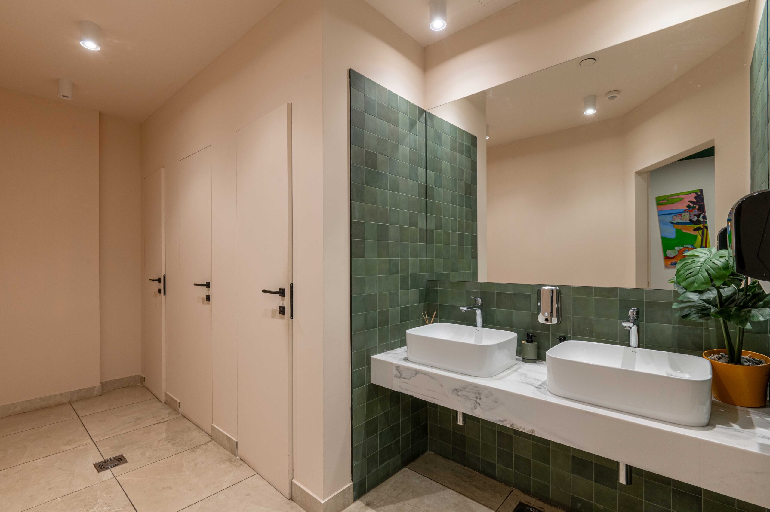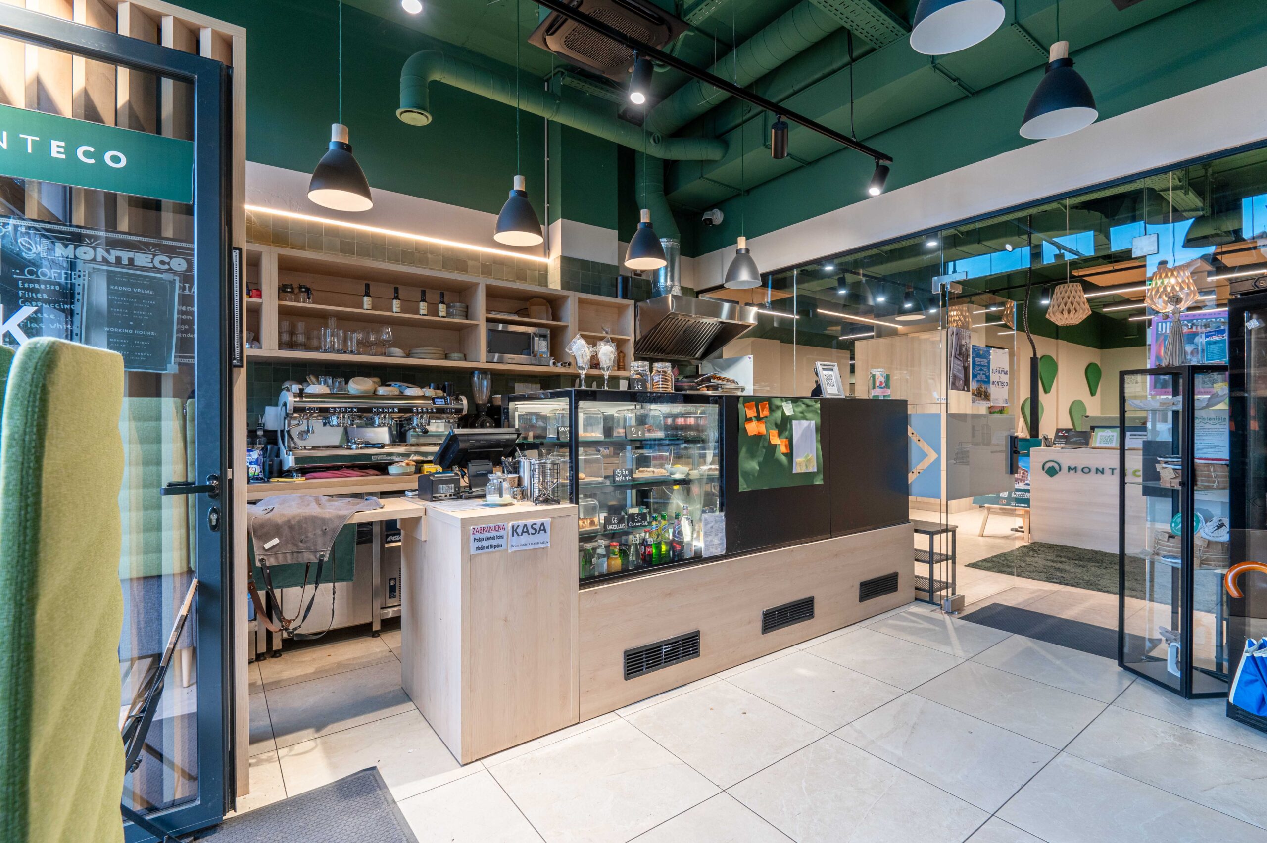 Ukupna površina obuhvata 112 m² privatnih kancelarija, 240 m² otvorenog komercijalnog prostora, 26 m² kuhinjskog dijela i 20 m² magacinskih prostora. Objekat ima tri zasebna ulaza direktno sa ulice i velike fasadne prozore koji obezbjeđuju odličnu vidljivost i prirodno osvjetljenje.