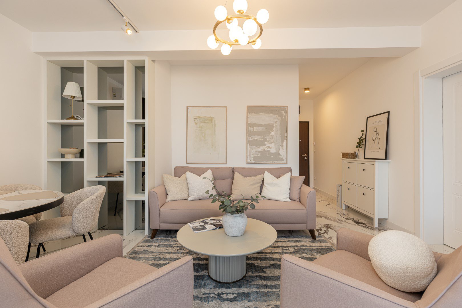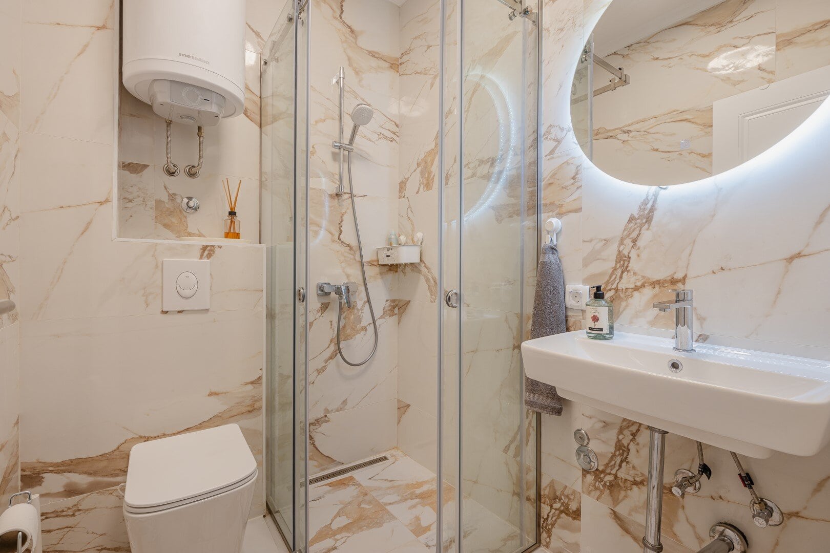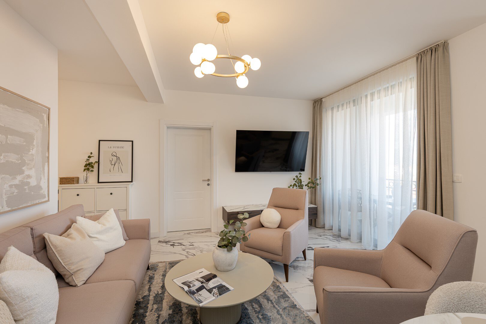 Stan je ukupne površine 62m2 i sastoji od prostranog dnevnog boravke, kuhinje sa trpezarijom i izlazom na terasu, spavaće sobe sa kupatilom i izlazom na terasu, dodatnog kupatila.
