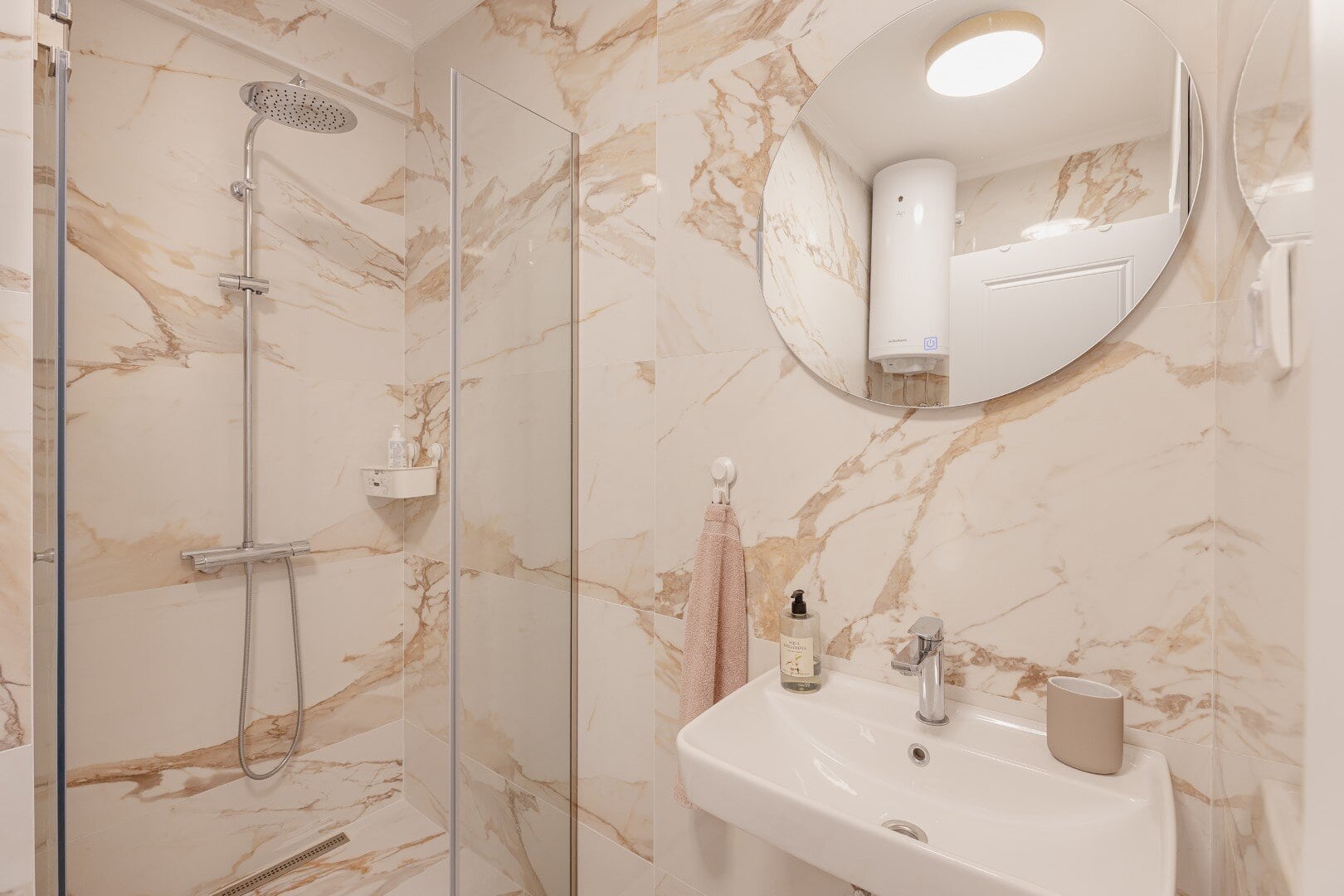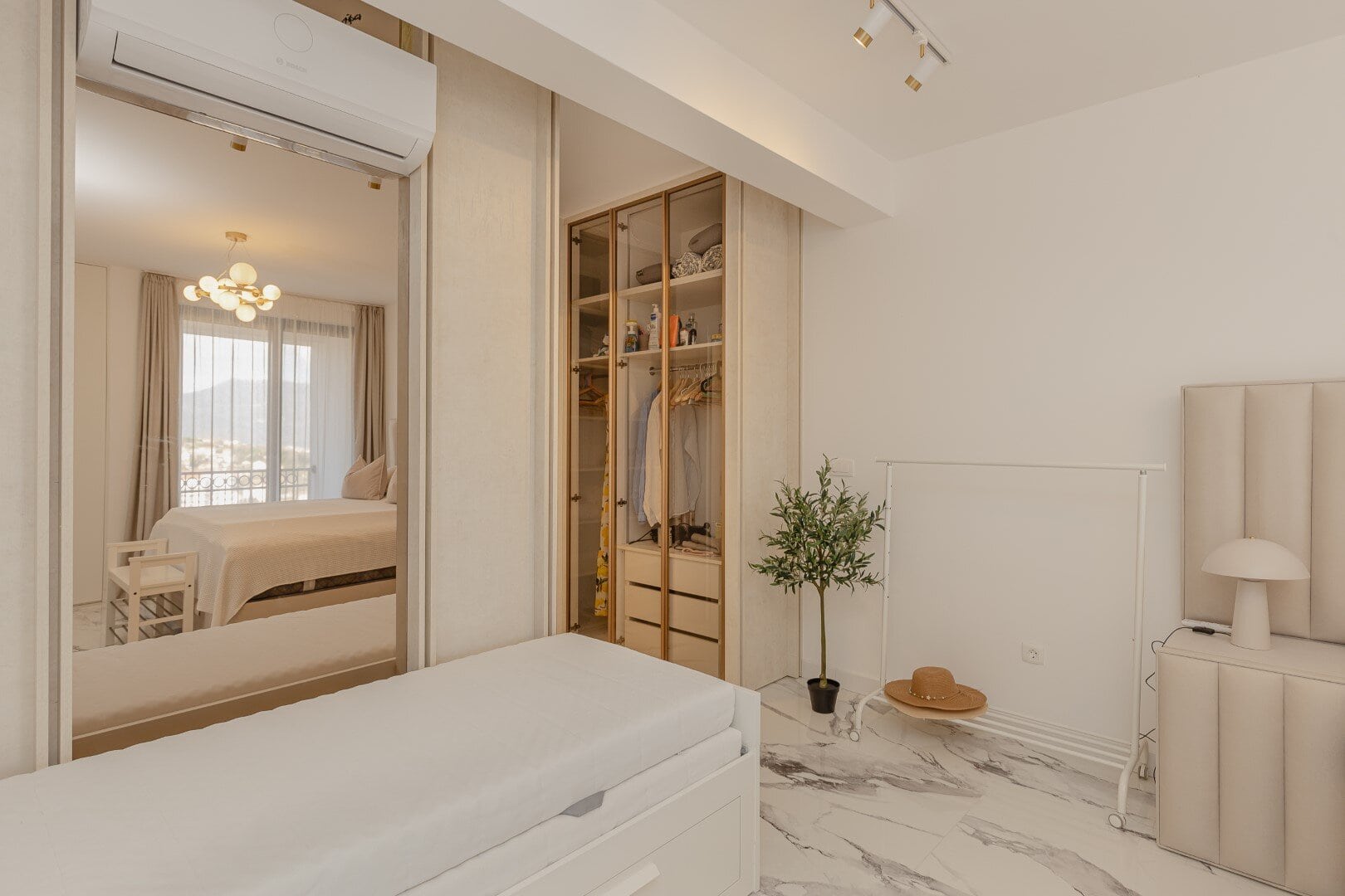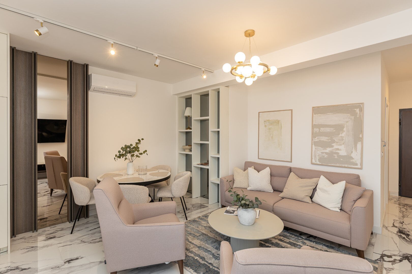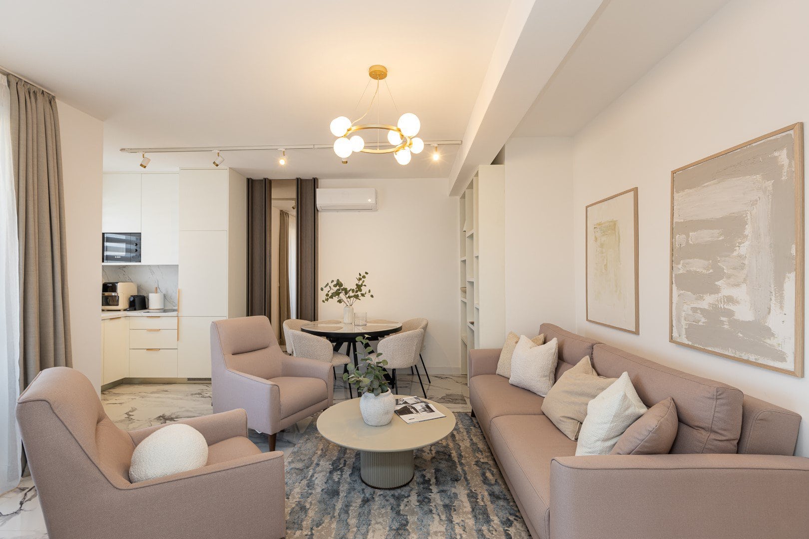Stan je ukupne površine 62m2 i sastoji od prostranog dnevnog boravke, kuhinje sa trpezarijom i izlazom na terasu, spavaće sobe sa kupatilom i izlazom na terasu, dodatnog kupatila.