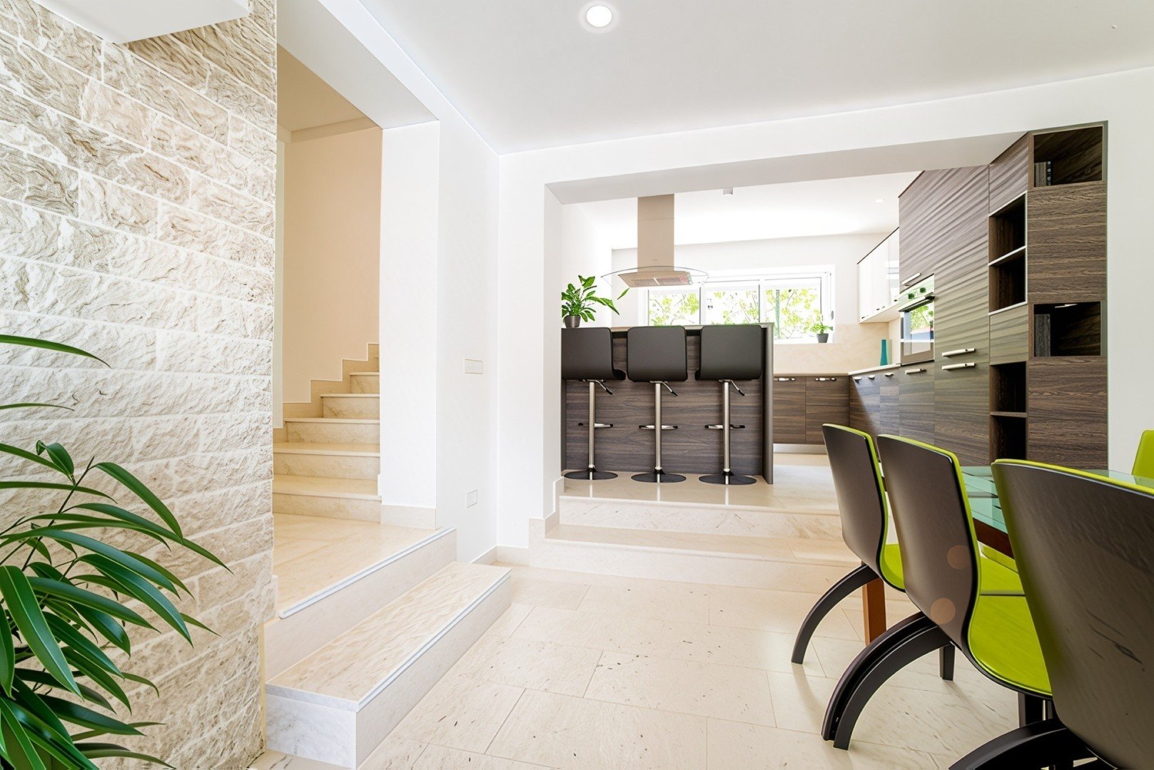 U izgradnji su korišteni kvalitetni materijali, sve prostorije su klimatizovane, podovi u sobama su od hrastovog parketa dok su stepeništa i pod u dnevnom boravku od obrađenog kamena.