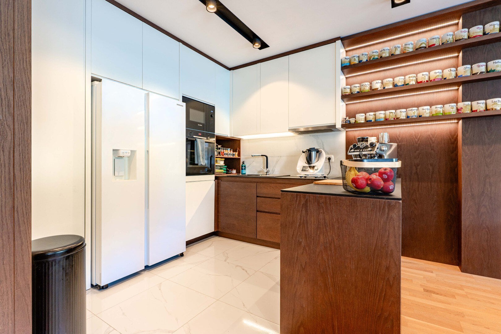 -Svi plakari rađeni od punog drveta, rađeni po mjeri i ugradjeni u arhitekturu stana sa unutrašnjom led rasvjetom.