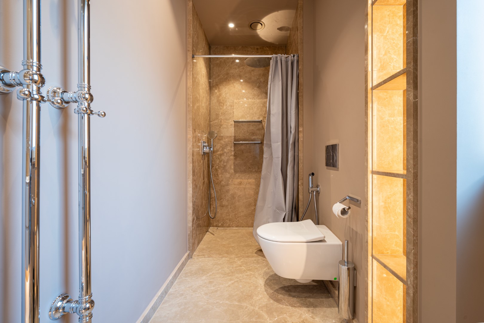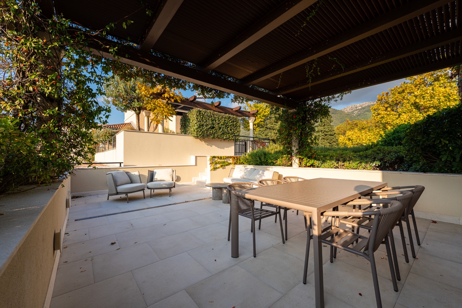 Apartman se sastoji od prostranog dnevnog boravka sa kuhinjom i izlazom na terasu pokrivenu pergolom i krovni bazen, tri en suite spavaće sobe, toaleta za goste sa vešerajem, pristupom na drugu terasu sa pogledom na more.