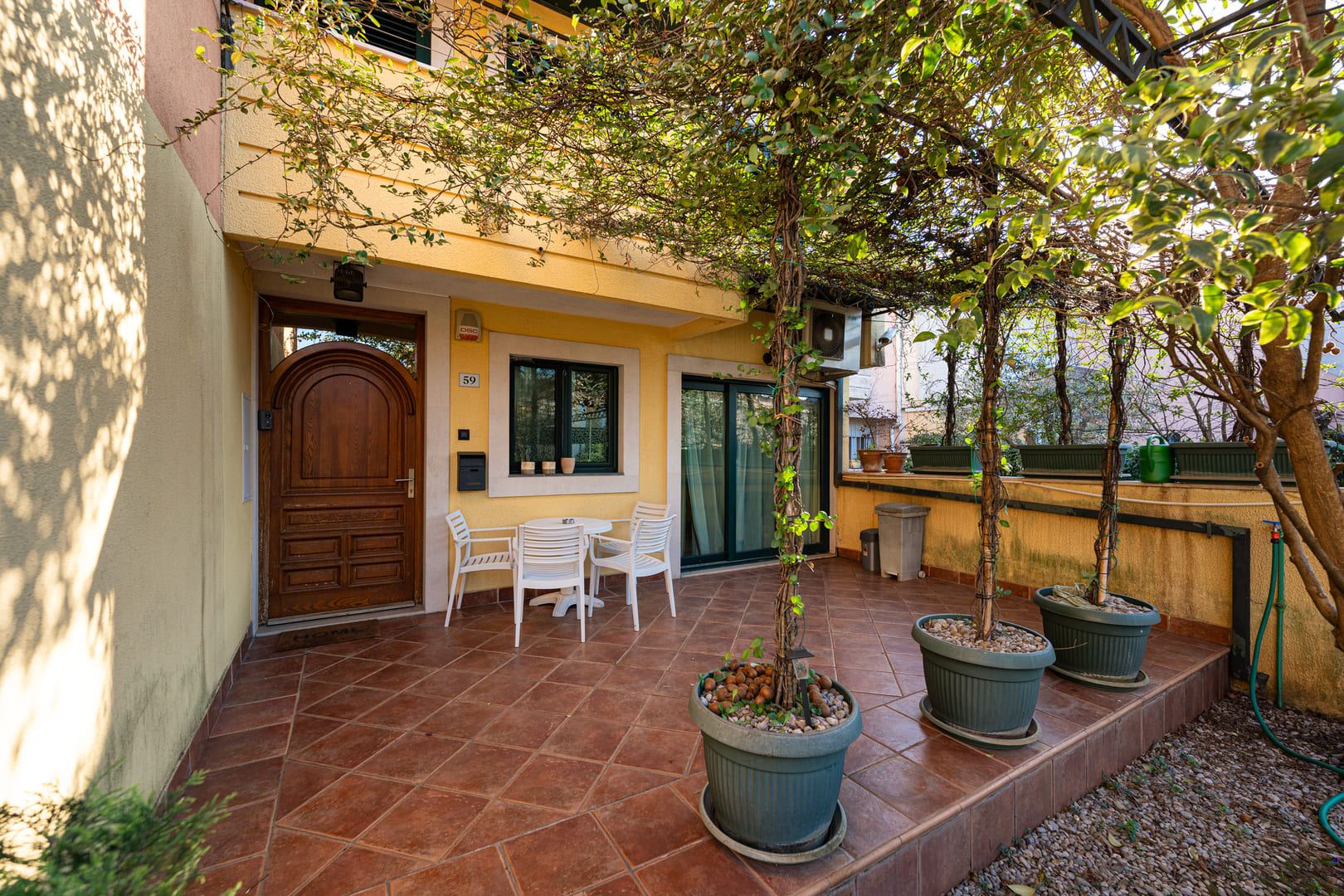 Prizemlje kuće se sastoji od prostranog dnevnog boravka sa izlazom na zastakljenu terasu i zadnje dvorište, kuhinjom i trpezarijom, toaleta u hodniku koji vodi do ulaznih vrata. Ispred ulaznih vrata postoji natkrivena terasa i uređeno dvorište sa sistemom navodnjavanja.